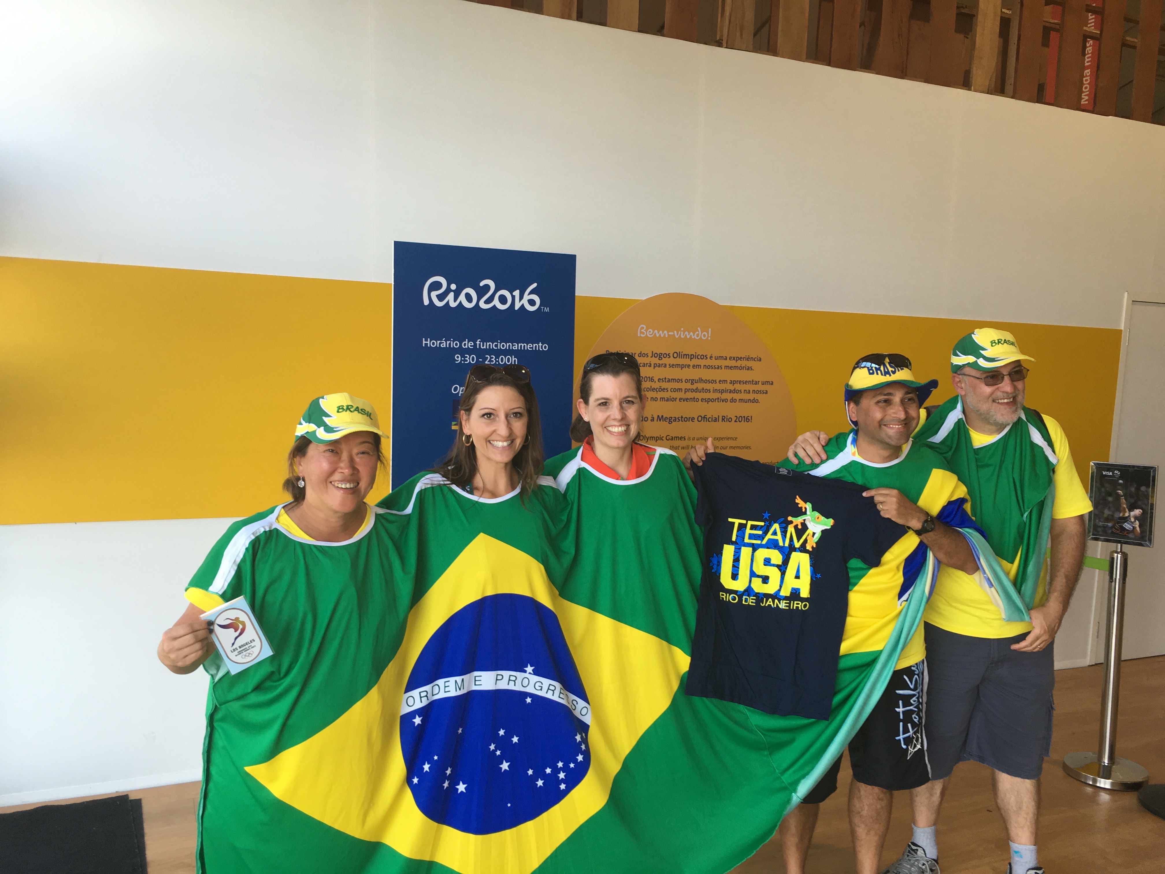 Like my doppelganger thousands of miles away! The Brazilians are so lucky to have her knowledge and patients, and most of all.. her skills. We happened to also be in line for the store yesterday, and got to talking with a family from Brazil (it was Father’s Day here yesterday, and the man and his Dad were here to watch!). They were an absolute example of the kind hearted nature of the Brazilian people. I tried to do a little Portuguese, they tried a bit of English. We laughed, we hugged, and in the end, took a fabulous picture! He has two daughters, who love gymnastics and “Miss See-moneee!” So, I knew this was one of the people to give my US shirt to! He cried with appreciation, handed me three brazil slap bracelets for my kids (After, of course, we did the whole show your kids picture thing!), and we traded pins. With Raquel, the PT, she gave me the pin of the Physical Therapy group that provided care for the athletes here. SO GREAT!